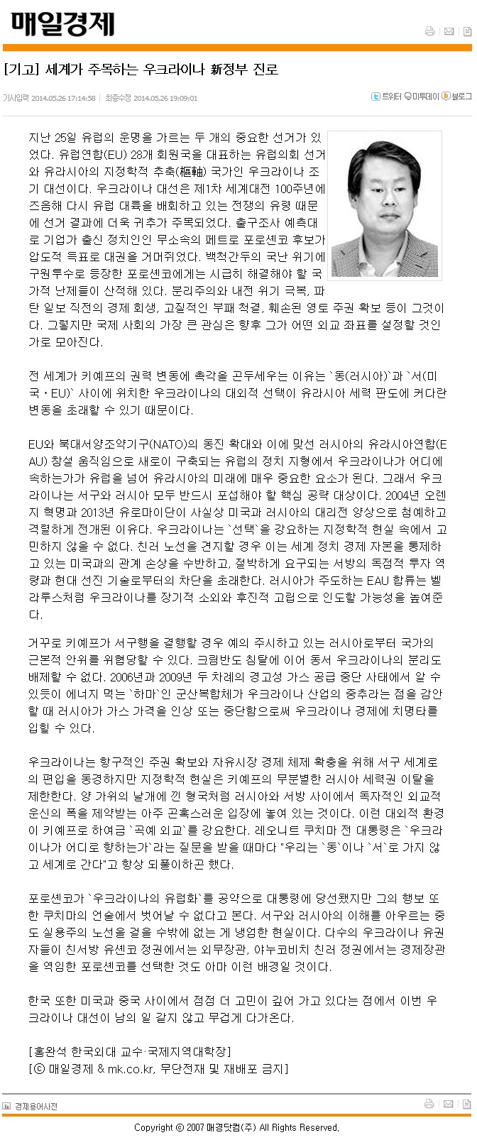 [언론보도][기고/홍완석] 세계가 주목하는 우크라이나 신정부 진로 2014.05.27.