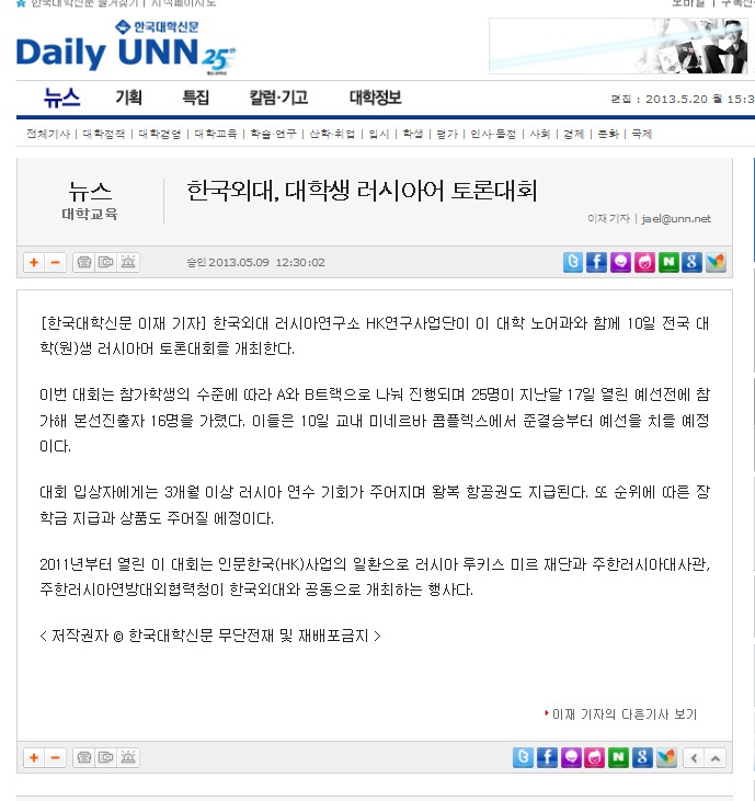 2013년 5월 10일(금) 한국외대 서울캠퍼스 미네르바 콤플렉스에서 러시아연구소(소장 홍완석 교수) HK연구사업단은 러시아 루스키 미르 재단 및 주한 러시아대사관, 주한 러시아연방 대외협력청과 공동으로 제3회 전국 대학(원)생 러시아어 토론대회를 개최했다. 전국 대학에서 신청한 응모자들을 대상으로 사전 예선을 거쳐 이번 토론대회에는 본선 진출자 16명이 최종 참가했다.