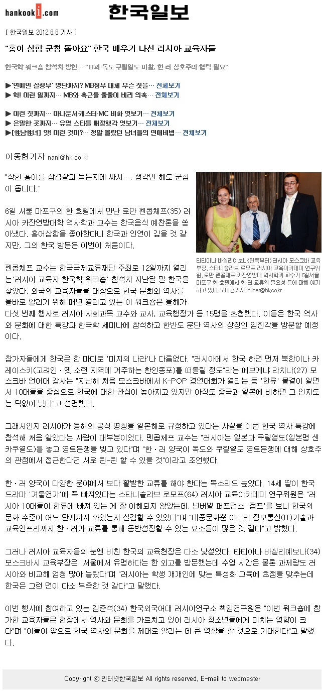 [언론보도]"홍어 삼합 군침 돌아요" 한국 배우기 나선 러시아 교육자들-한국일보(2012.08.08)