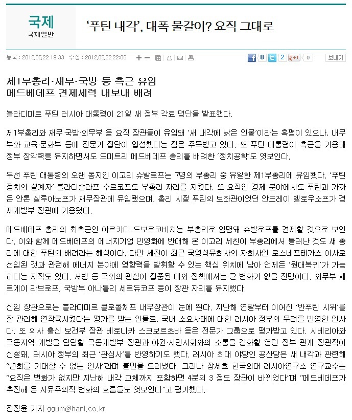 [언론보도]‘푸틴 내각’, 대폭 물갈이? 요직 그대로-한겨레(2012.05.22)