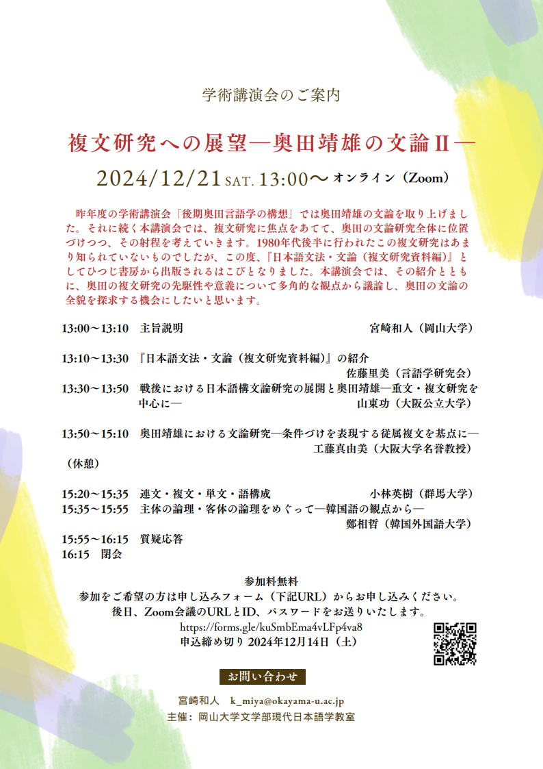 学術講演会 '複文研究への展望 -奥田靖雄の文論Ⅱ-' のご案内