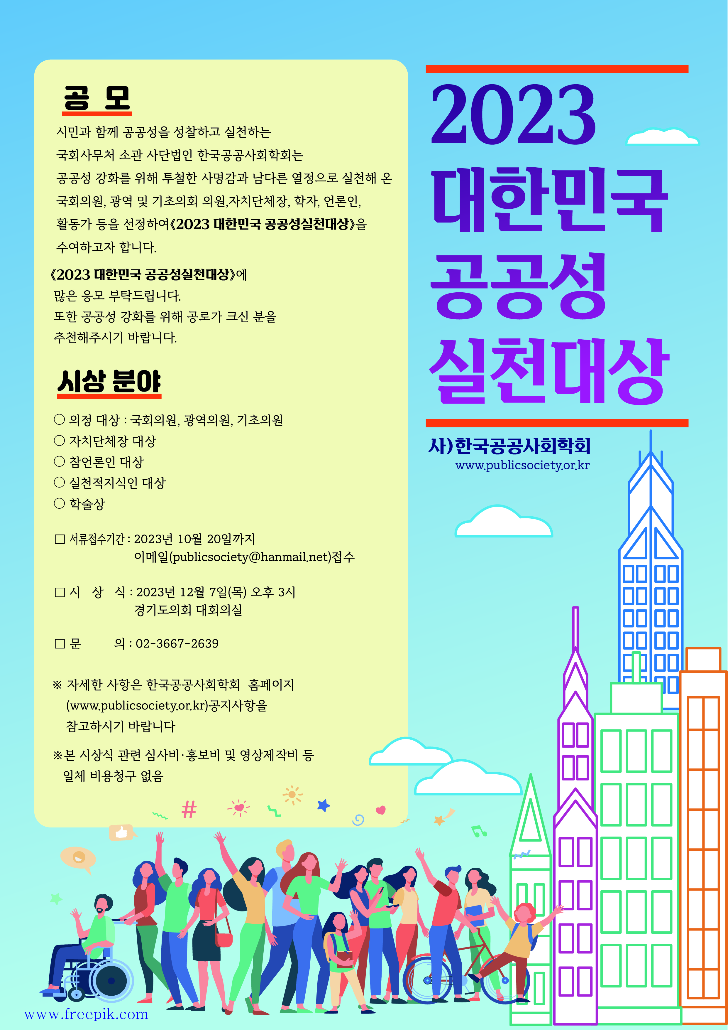 2023년 대한민국 공공성실천 대상에 많은 응모부탁드립니다. 또한 공공성실천을 위해 공로가 크신 분을 추천해주시기 바랍니다