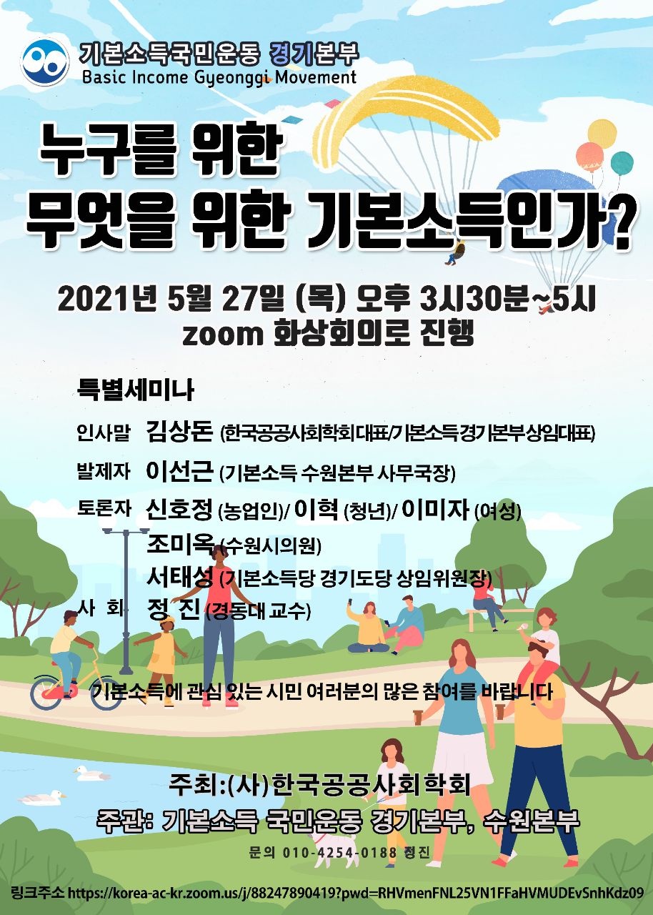 ()한국공공사회학회와 기본소득 국민운동경기본부, 수원본부는 2021527() '누구를 위한, 무엇을 위한 기본소득인가?' 주제로, 기본소득 시민특별세미나를 개최합니다. 이번 세미나에서는 기본소득에 대한 개념, 필요성, 재원 마련방안에 대해 성찰하고 소통, 공감할 수 있는 공공성의 이오니 부디 참석하셔서 여러분의 소중한 제언과 훌륭한 고견을 나눠주시기를 바랍니다.