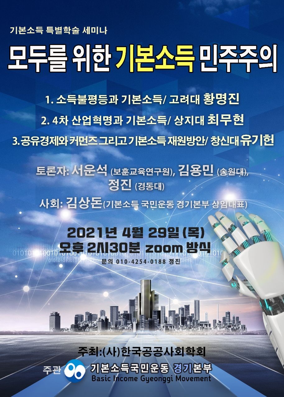 ()한국공공사회학회와 기본소득 국민운동경기본부는 2021년 4월 29( '모두를 위한 기본소득 민주주주의' 주제로, 특별 학술세미나를 개최합니다. 이번 학술세미나에서는 기본소득의 필요성과 재원마련방안에 대해 성찰하고 소통, 공감할 수 있는 자리에 부디 참석하셔서 여러분의 소중한 제언과 훌륭한 고견을 나눠주시기를 바랍니다.