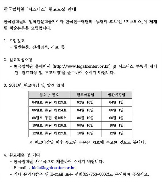 2011 한국법학원 \'저스티스\' 원고모집 안내