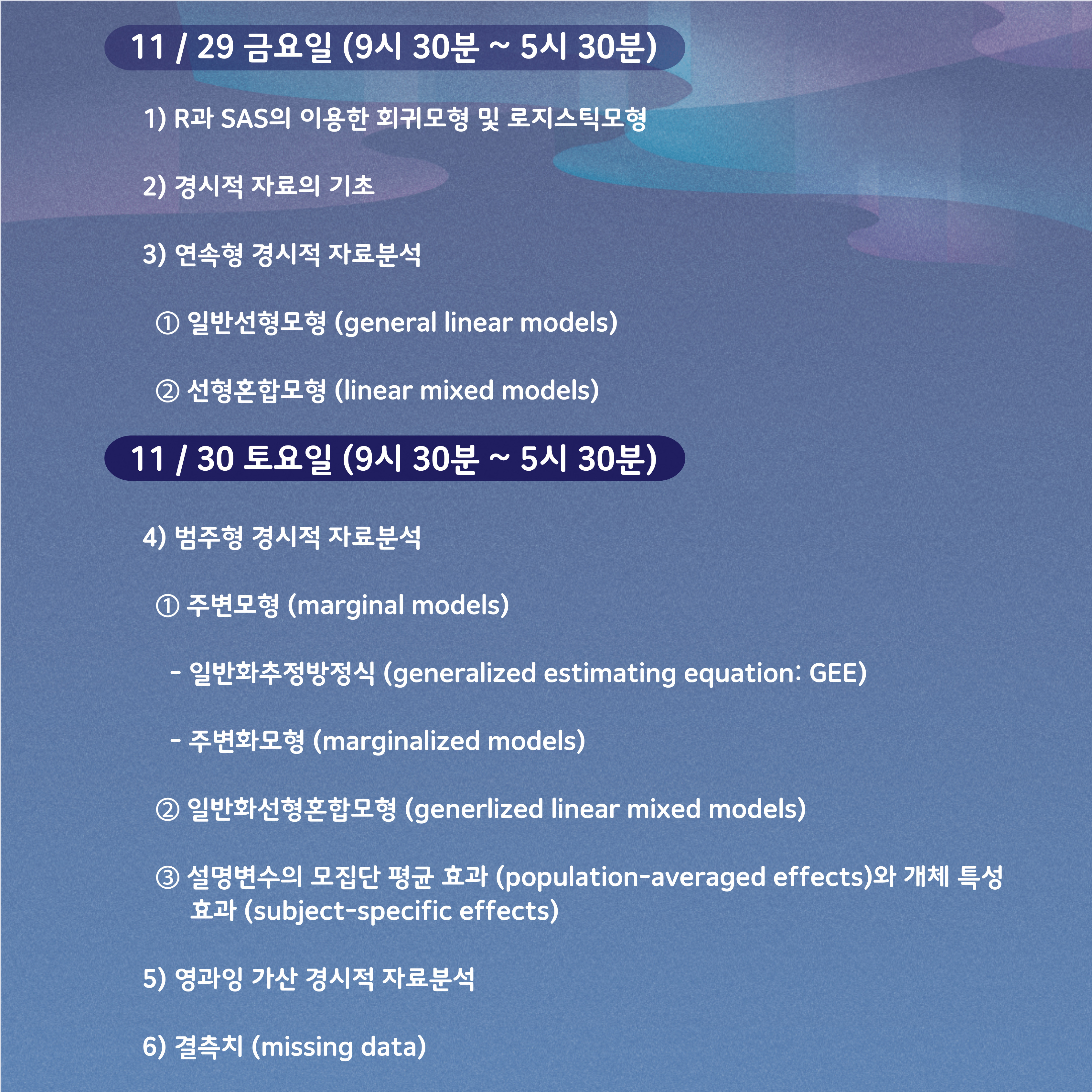 - 이번 통계특강은 모두 온라인으로 진행됩니다. 접속 방법은 특강 시작 전에 따로 안내드릴 예정입니다.