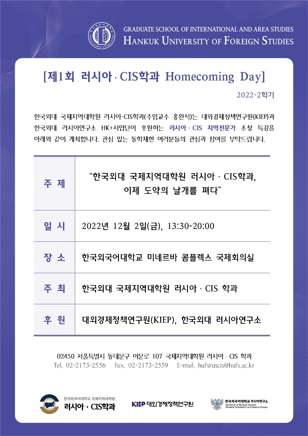2022학년도 2학기 12차 특강: 제1회 러시아-CIS학과 Homecoming Day - '유라시아 정세 변화와 러시아' 특별학술회의