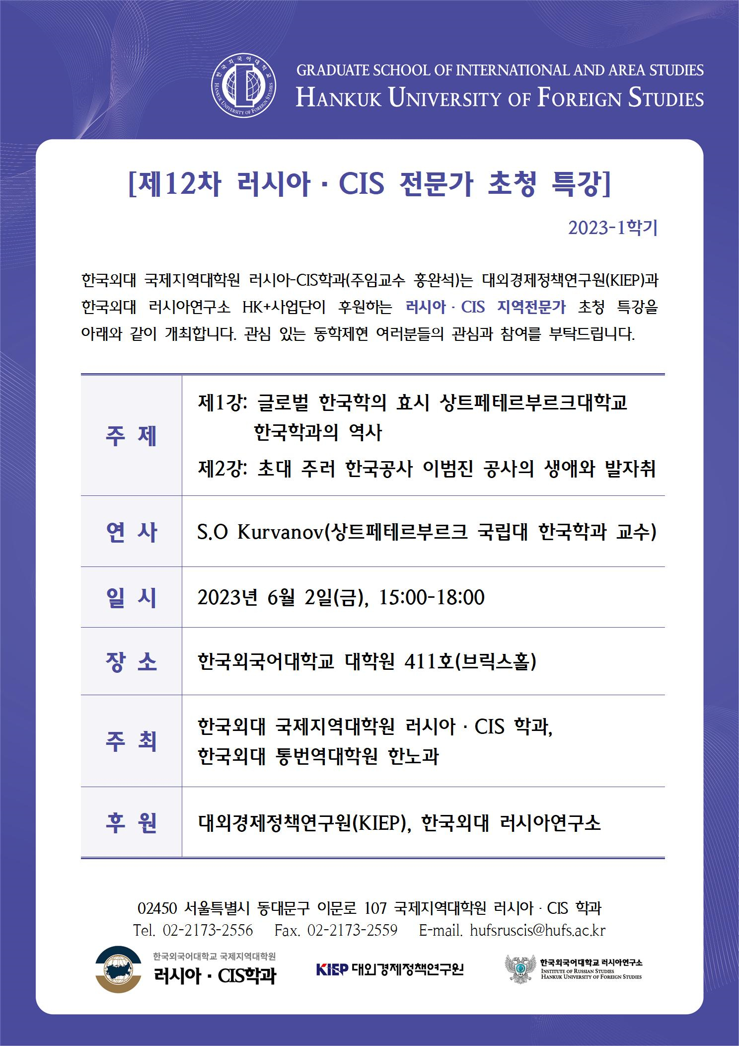 2023학년도 1학기 12차 특강: 글로벌 한국학의 효시 상트페테르부르크대학교 한국학과의 역사/초대 주러 한국공사 이범진 공사의 생애와 발자취