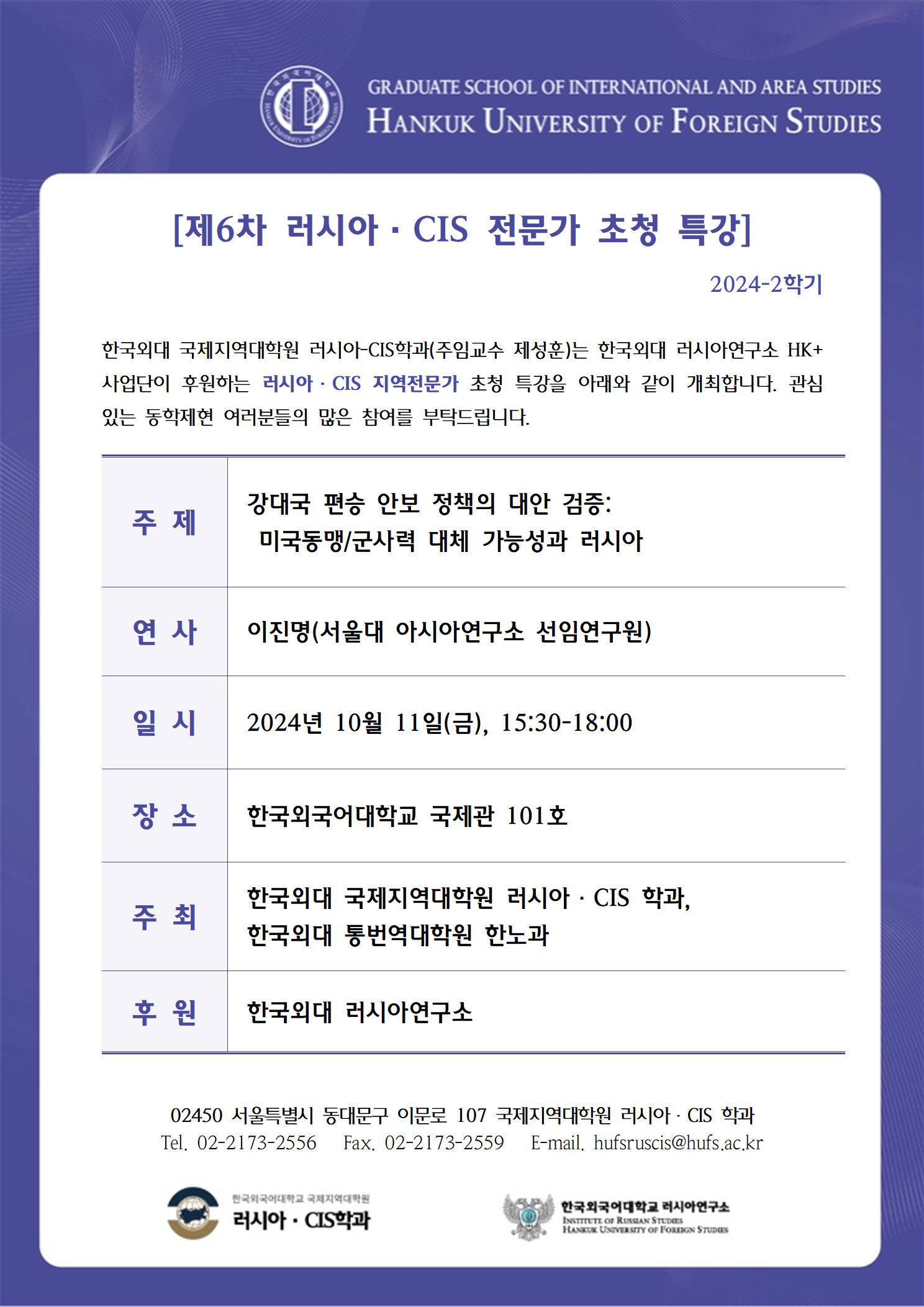 2024학년도 2학기 6차 특강: 강대국 편승 안보 정책의 대안 검증: 미국동맹/군사력 대체 가능성과 러시아