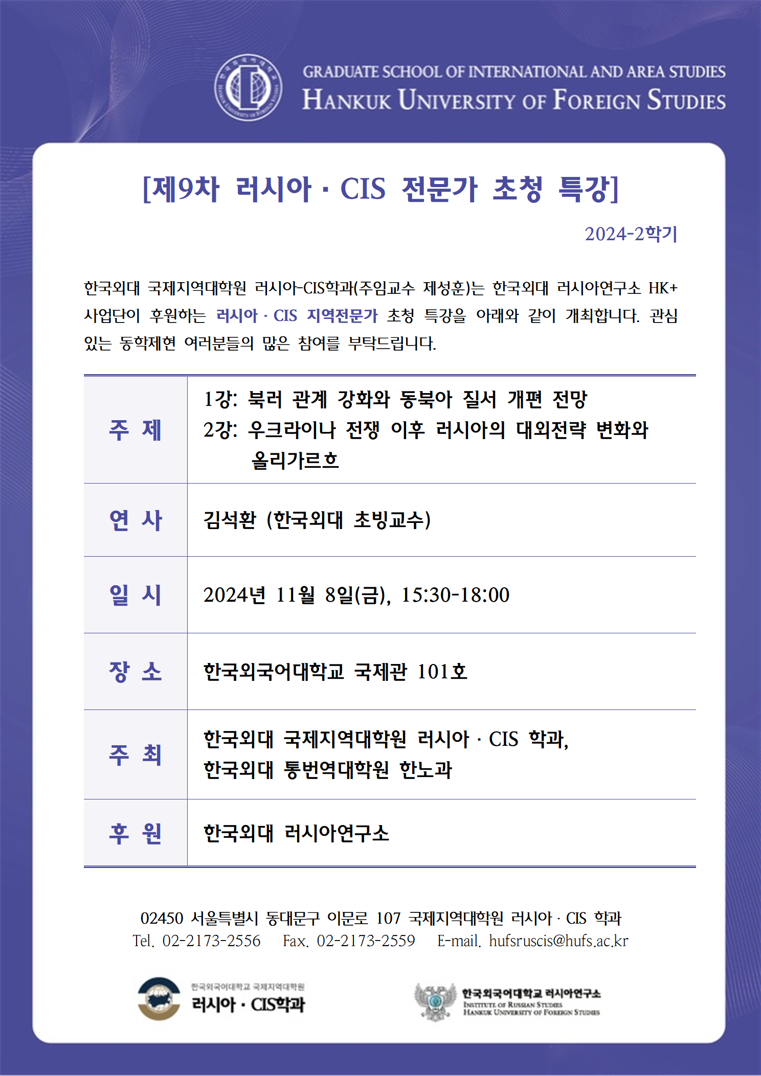 2024학년도 2학기 9차 특강: 북러 관계 강화와 동북아 질서 개편 전망/우크라이나 전쟁 이후 러시아의 대외전략 변화와 올리가르흐