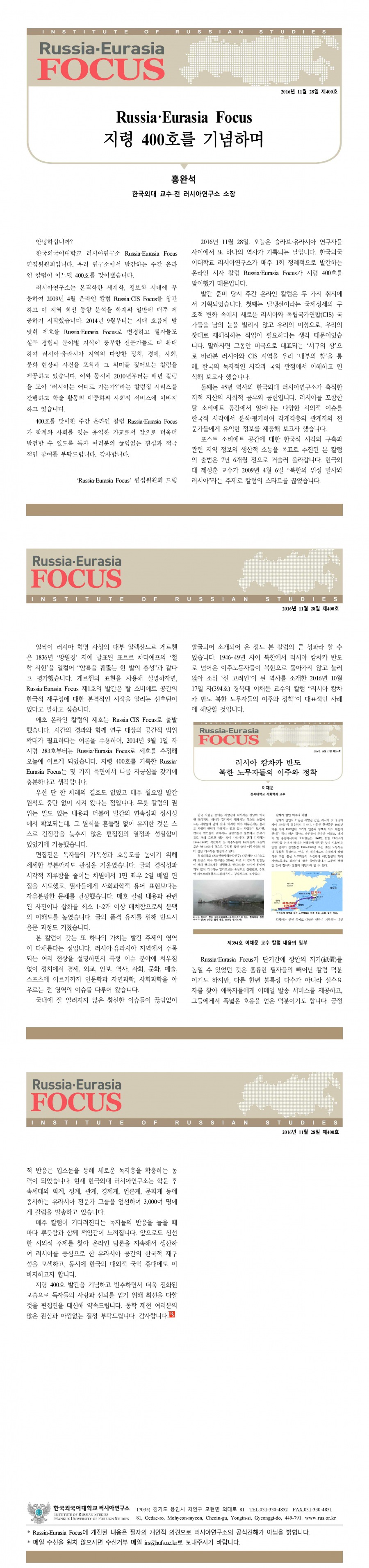 제400호 Russia·Eurasia Focus 지령 400호를 기념하며
