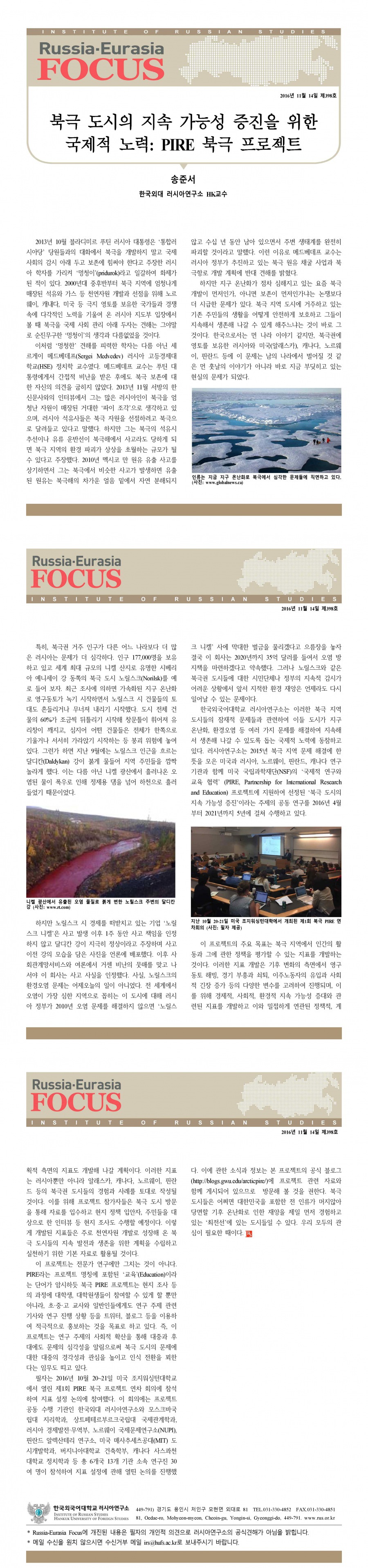 제398호 북극 도시의 지속 가능성 증진을 위한 국제적 노력: PIRE 북극 프로젝트