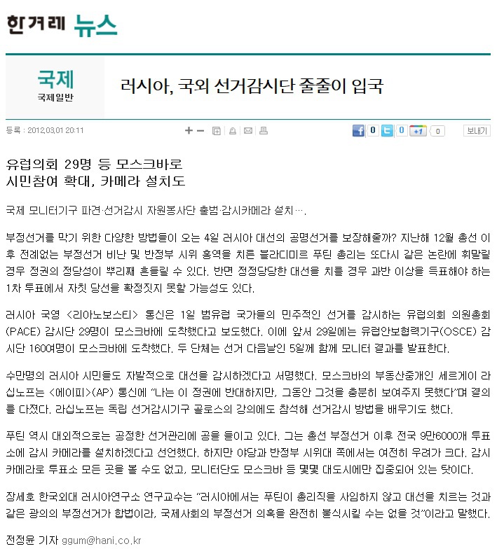 [언론보도]러시아, 국외 선거감시단 줄줄이 입국-한겨레(2012.3.1)