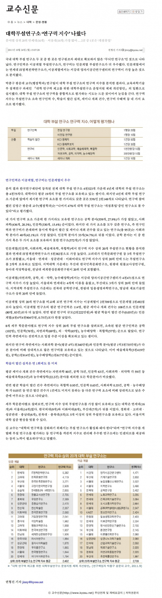 [지면기사] 대학부설연구소 ‘연구력 지수’ 나왔다 - 교수신문(2011.10.24)