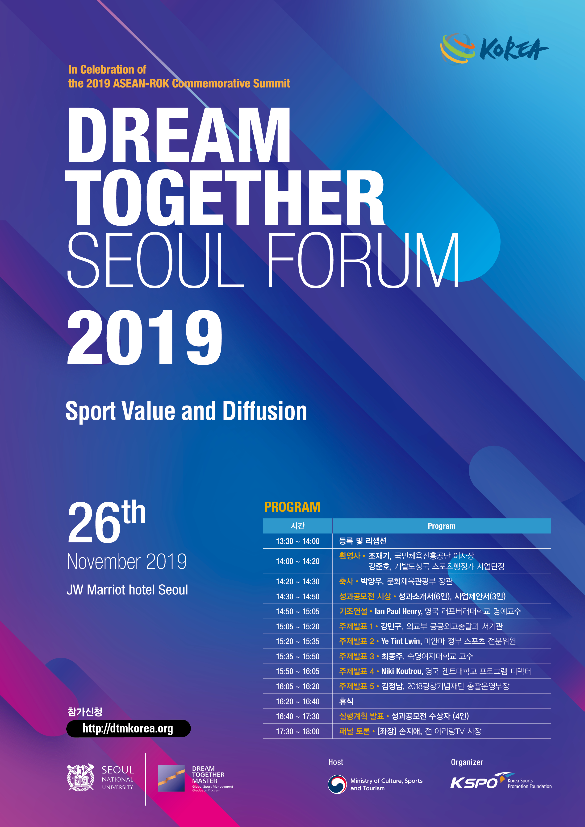 문화체육관광부와 국민체육체진흥공단은 스포츠 활동으로 인한 스포츠 가치 주제로 2019. 11.26(화) JW메리어트 호텔에서 '2019 드림 투게더 서울 포럼'을 개최합니다.