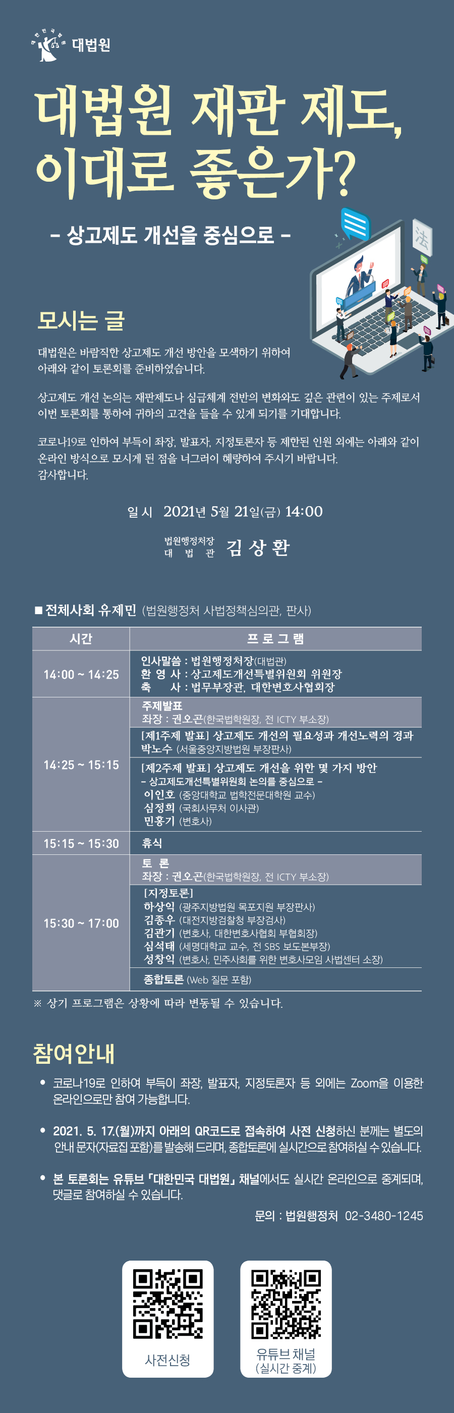 대법원은 사법행정자문회의 및 그 산하 상고제도개선특별위원회를 중심으로 상고제도 개선의 필요성과 구체적인 개선방안 등에 관한 연구·검토를 실시하고 있는데그와 관련하여 아래와 같이 상고제도 개선을 주제로 한 토론회를 개최하게 되었습니다.