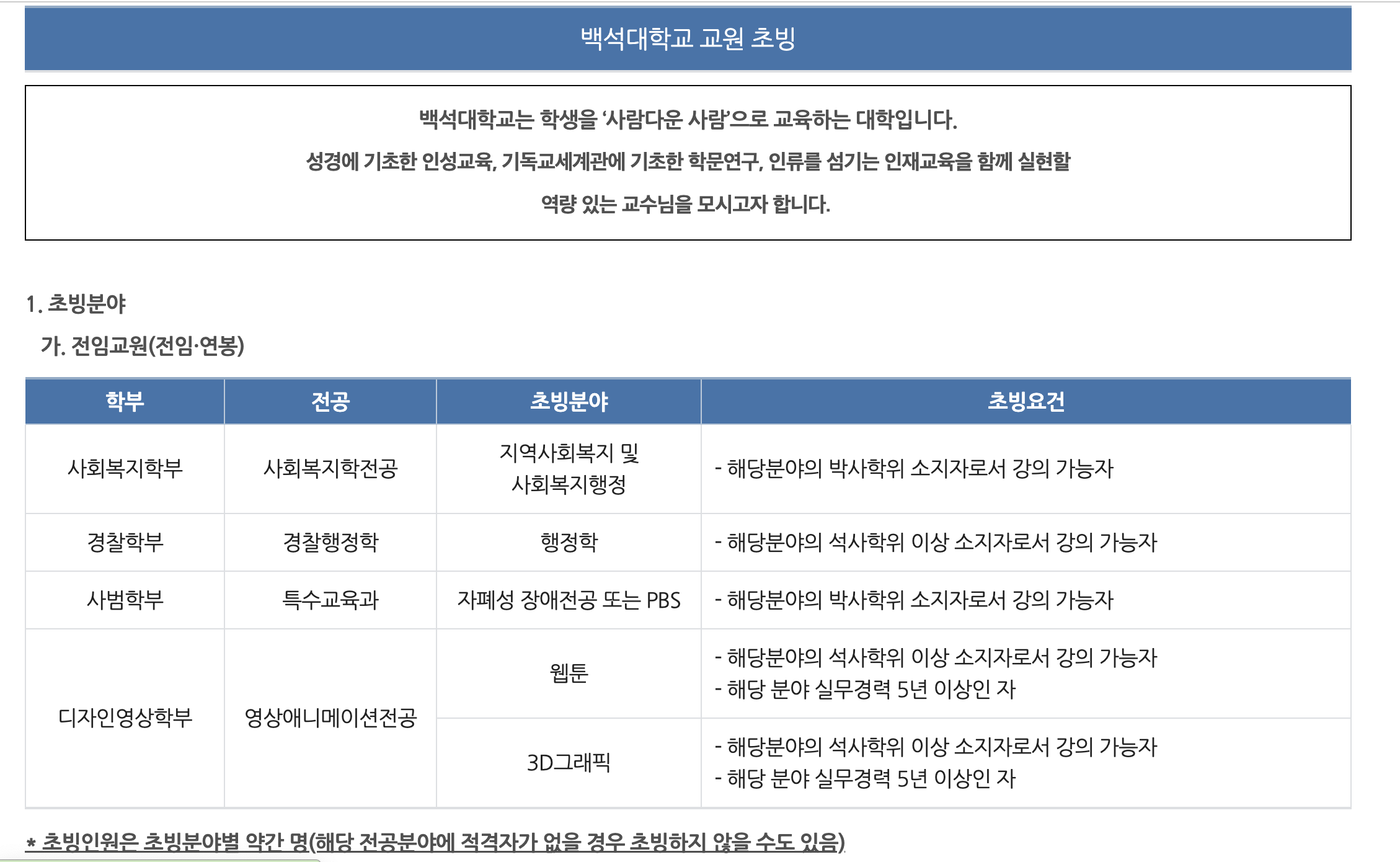 -백석대학교 교원 초빙 안내: https://www.bu.ac.kr/web/3483/subview.do?enc=Zm5jdDF8QEB8JTJGbWFpbk5vdGljZSUyRndlYiUyRjQ0MzkwJTJGYXJ0Y2xWaWV3LmRvJTNG