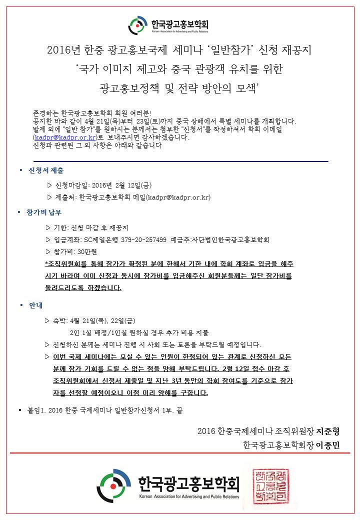 [KADPR]<수정>2016년 한중 광고홍보 국제 세미나 일반참가 신청 안내
