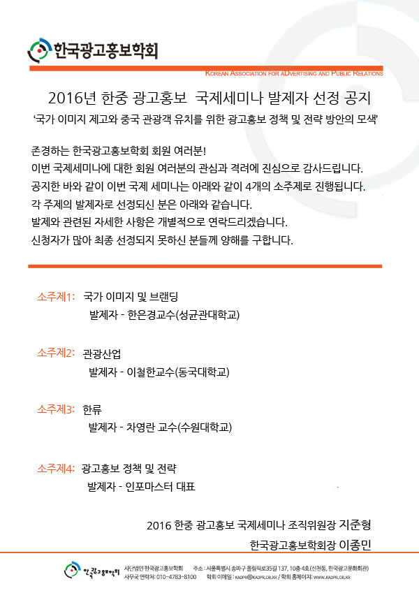 [KADPR] 2016년 한중 광고홍보 국제세미나 발제자 선정 공지