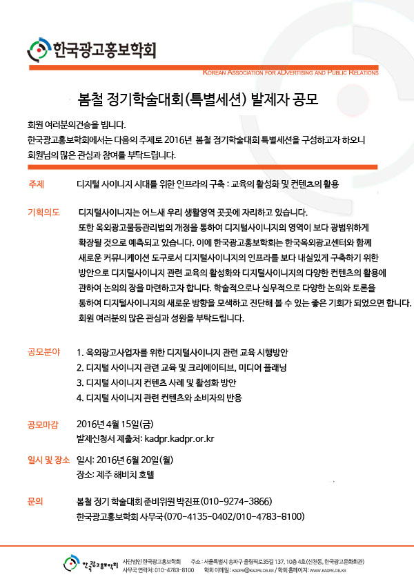 [KADPR] 2016 봄철 정기학술대회 특별세션(디지털 사이니지 시대를 위한 인프라의 구축: 교육의 활성화 및 컨텐츠의 활용) 발제자 공모