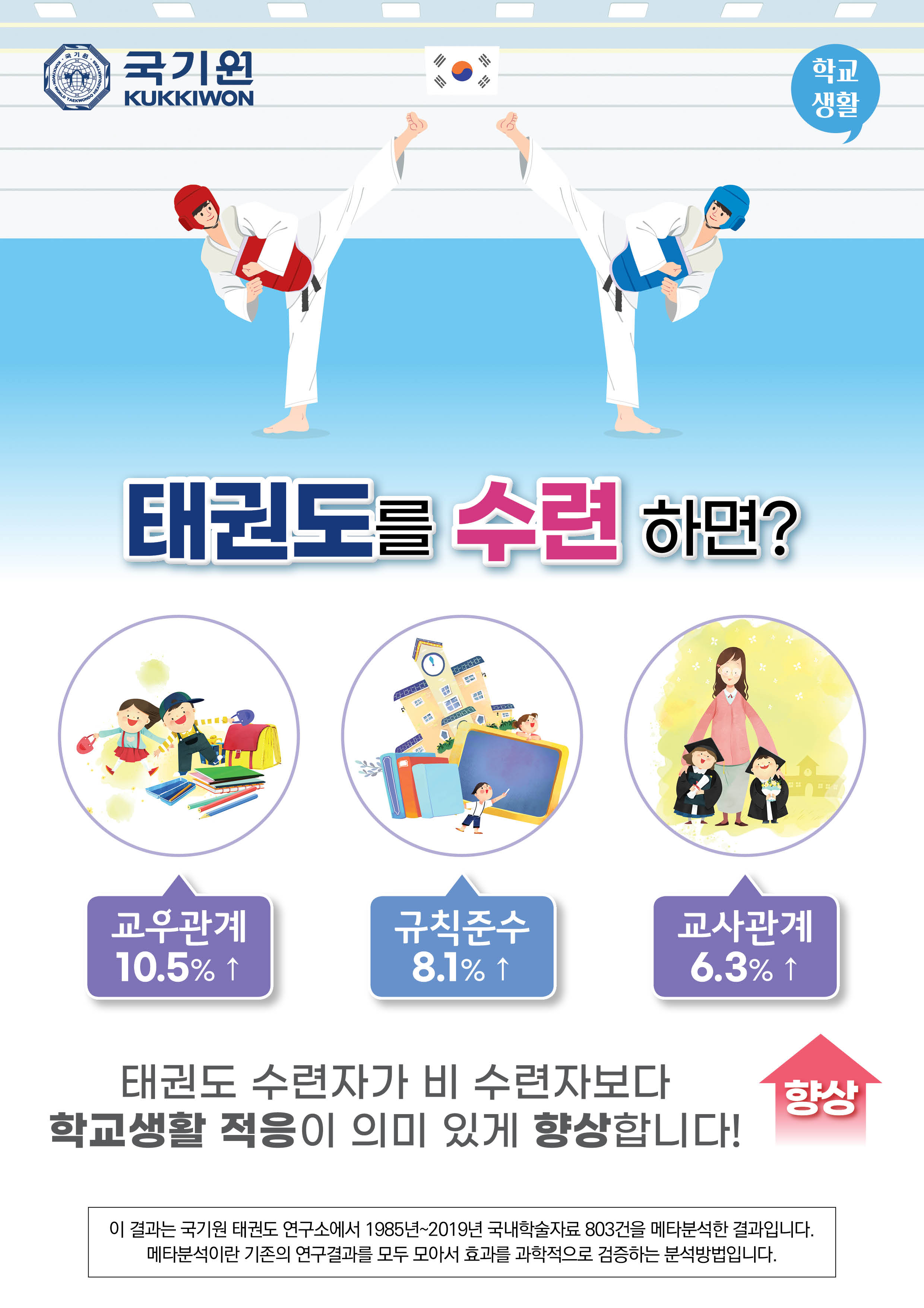 태권도를 수련하면 학교생활 적응이 개선된다는 연구결과입니다.