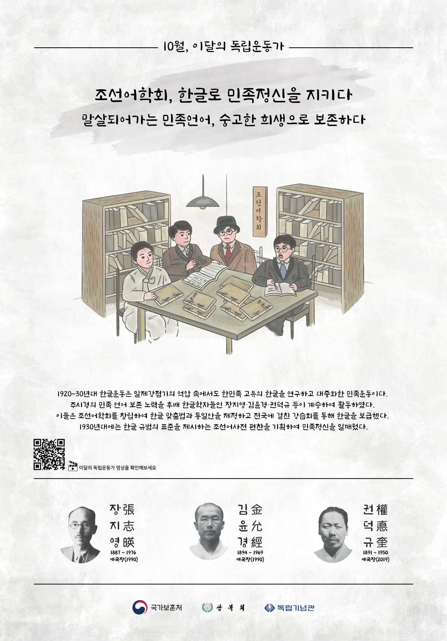 평생 한글연구에 매진하시고 보급에 힘쓰신 장지영, 김윤경, 권덕규 선생님들의 활동을 기리려고 합니다.