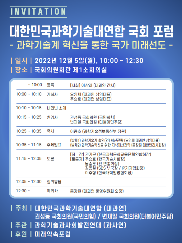 [대한민국과학기술대연합] 국회 포럼 "과학기술계 혁신을 통한 국가 미래선도" (12/5, 국회의원회관)