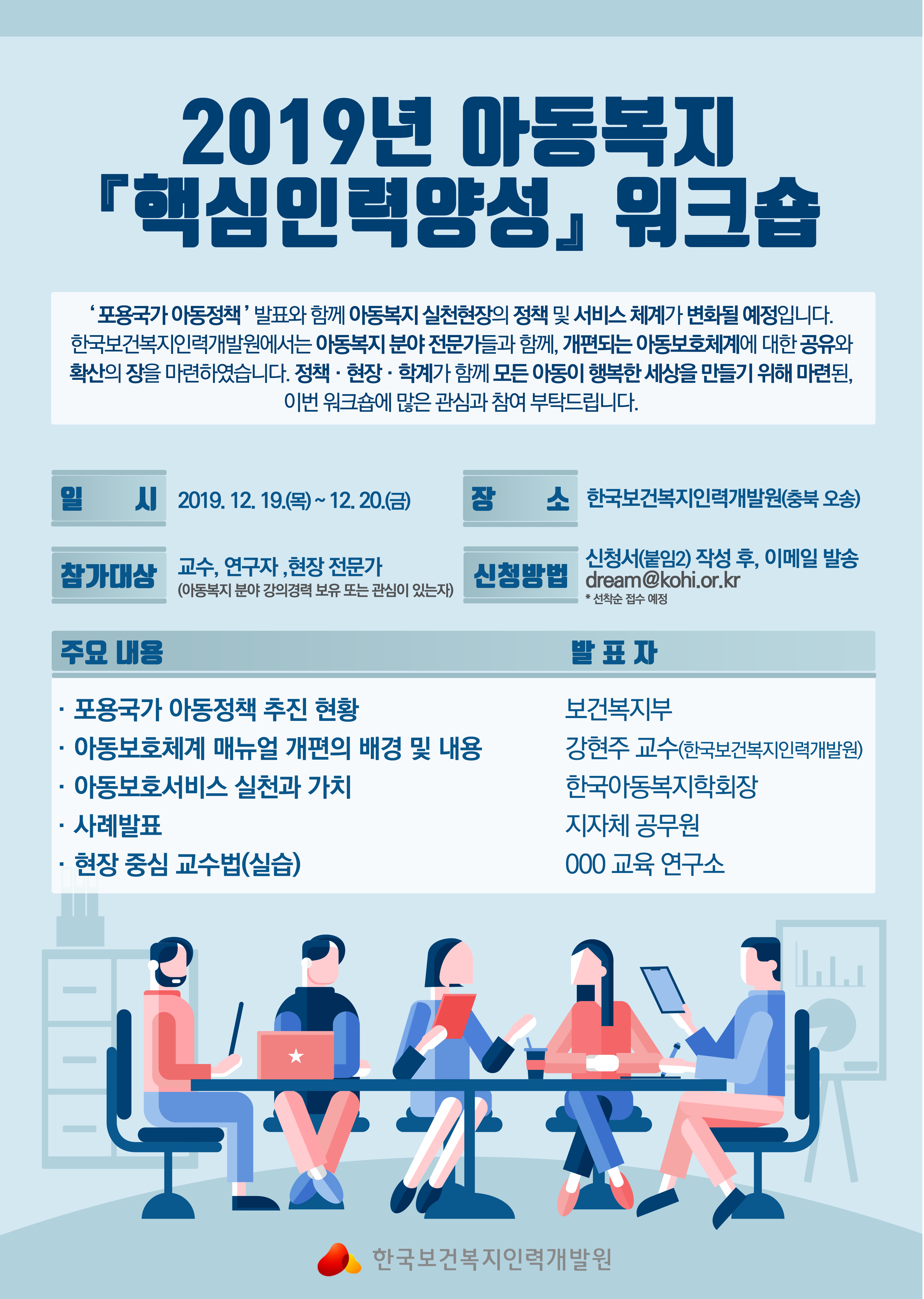 한국보건복지인력개발원에서는 아동복지 분야 전문가들과 함께, 개편되는 아동보호체계에 대한 공유와 확산의 장을 마련하였습니다. 정책·현장·학계가 함께 모든 아동이 행복한 세상을 만들기 위해 마련된, 이번 워크숍에 많은 관심과 참여 부탁드립니다.