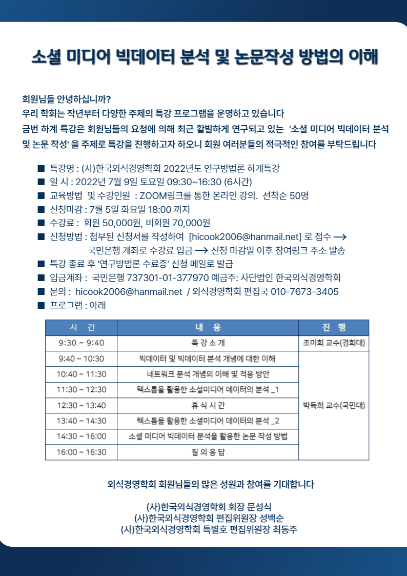▣ 행사명 : (사)한국외식경영학회 2022년도 연구방법론 하계 특강