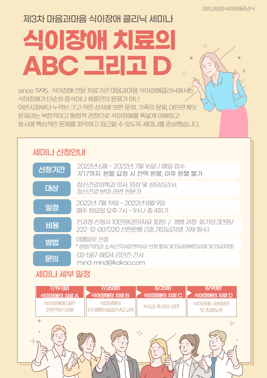 이번 세 번째 마음과 마음 식이장애 클리닉의 세미나에 여러분의 많은 관심과 참여를 부탁드립니다. 감사합니다.