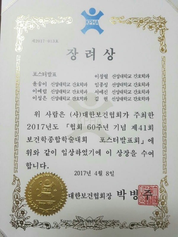 2017년도 보건학종합학술대회 학생 연구경연대회 및 포스터 발표에서 신성대학교 간호학과 학생들이 참가하여 수상하였습니다.