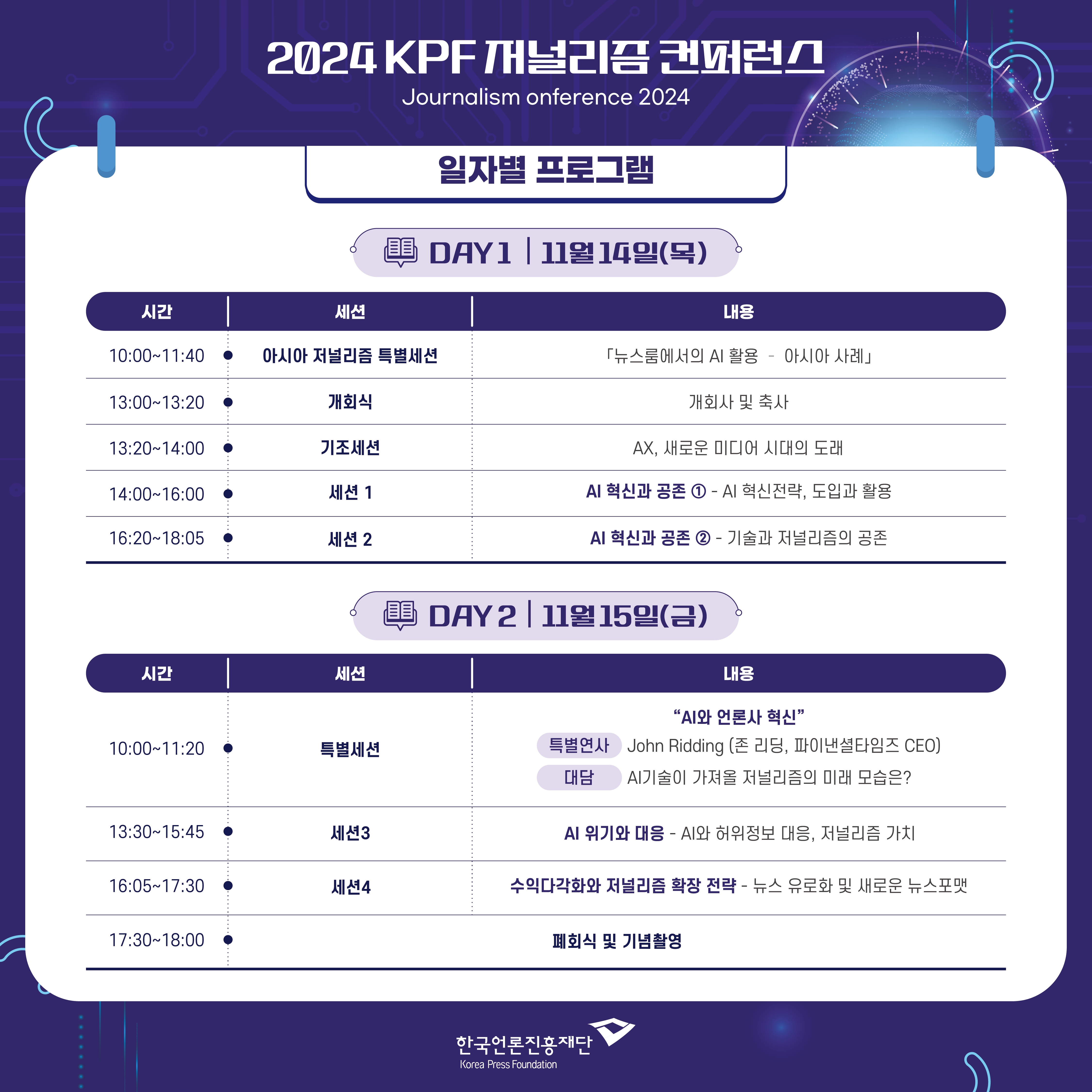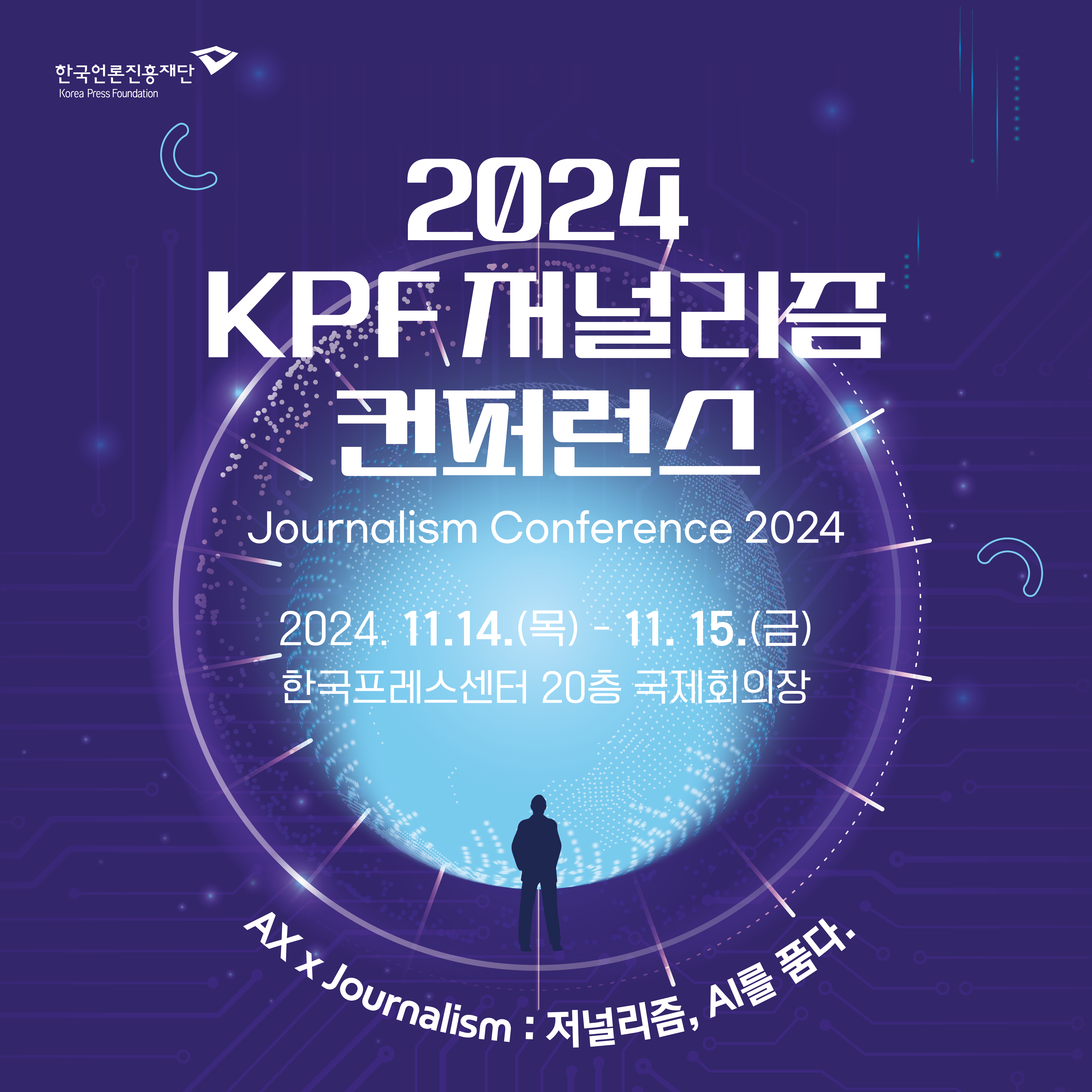 올해에는 ‘AX x Journalism : 저널리즘, AI를 품다’를 주제로 11.14.(목)~11.15.(금) 한국프레스센터에서 컨퍼런스를 개최합니다.