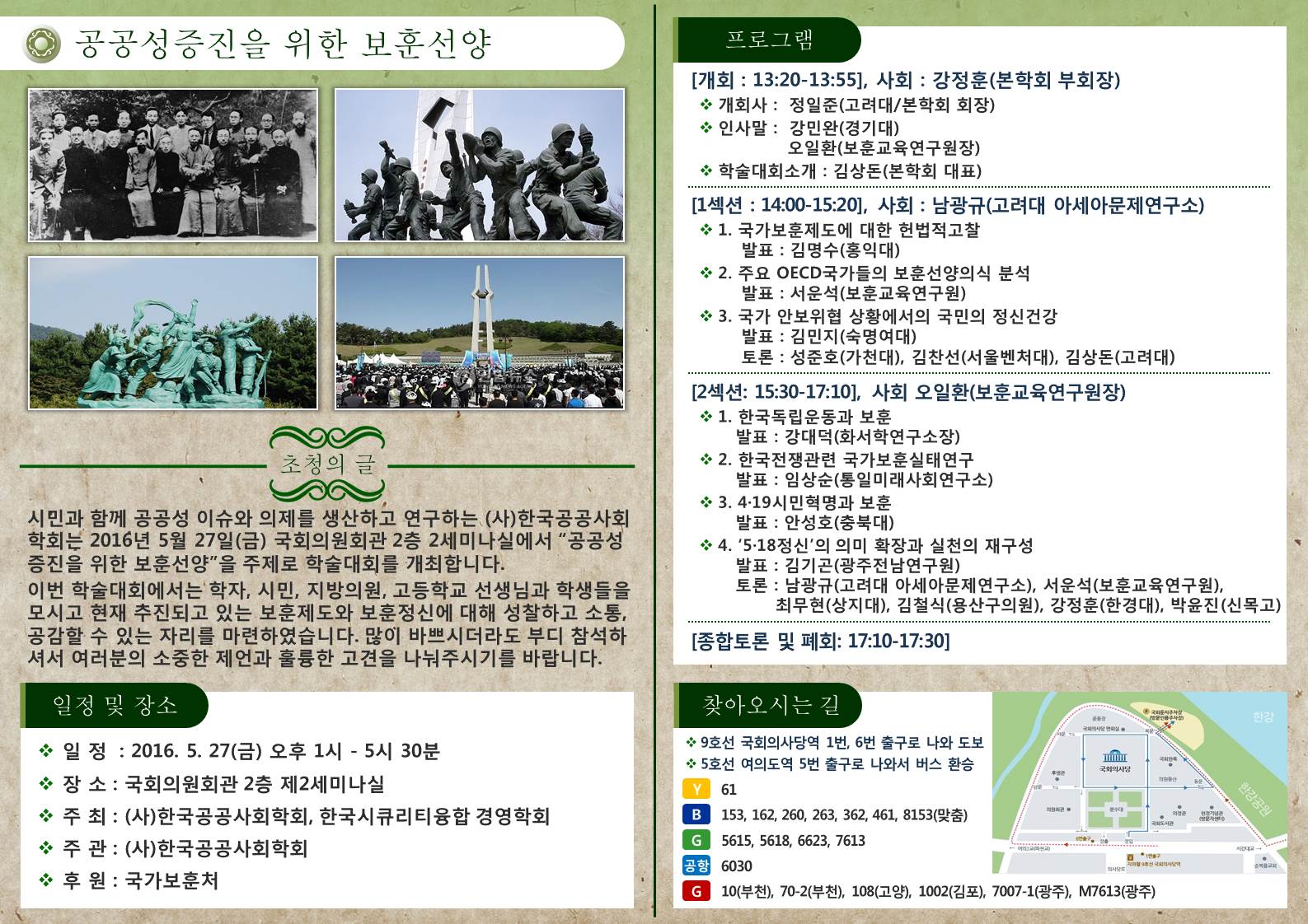 시민과 함께 공공성 이슈와 의제를 생산하고 연구하는 (사)한국공공사회학회는 2014년 5월 27일(목) 국회의원회관 2층 2세미나실에서 “공공성증진을 위한 보훈선양” 주제로 학술대회를 개최합니다. 이번 학술대회에서는 학자, 시민, 고등학교 교사와 교원들을 모시고 현재 추진되고 있는 보훈제도와 보훈정신에 대해 성찰하고 소통·공감할 수 있는 자리를 마련하였습니다. 많이 바쁘시더라도 부디 참석하셔서 여러분의 소중한 제언과 훌륭한 고견을 나눠주시기를 바랍니다.