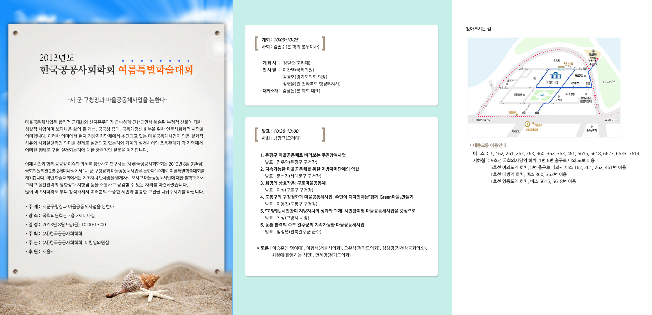 이에 시민과 함께 공공성 이슈와 의제를 생산하고 연구하는 (사)한국공공사회학회는 2013년 8월 9일(금) 국회의원회관 2층 2세미나실에서 “시·군·구청장과 마을공동체사업을 논한다” 주제로 여름특별학술대회를 개최합니다. 이번 학술대회에서는 기초자치 단체장을 발제자로 모시고 마을공동체사업에 대한 철학과 가치, 그리고 실천전략의 방향성과 지향점 등을 소통하고 공감할 수 있는 자리를 마련하였습니다. 많이 바쁘시더라도 부디 참석하셔서 여러분의 소중한 제언과 훌륭한 고견을 나눠주시기를 바랍니다.
