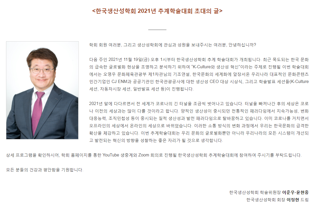 ▶ 참가방법:  개회식, 생산성CEO대상 시상식, 기조연설은 유튜 브 생중계로, 학술세션은 줌(Zoom)으로 참여 가능하십니다. 아래 공식 웹페이지에 접속하시어 상세 내용을 확인해 주시면 감사하겠습니다.