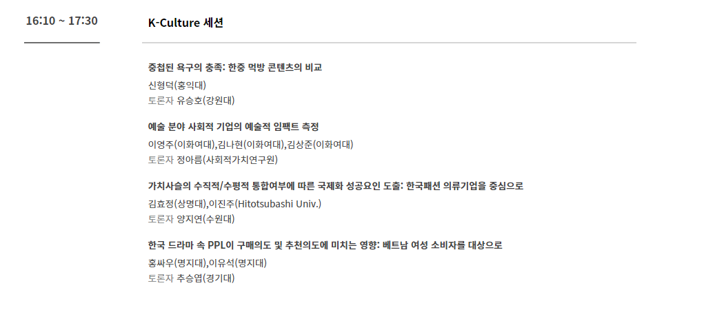 최근 목도되는 한국 문화의 급속한 글로벌화 현상을 조명하고 분석하기 위하여 “K-Culture와 생산성 혁신”이라는 주제로 진행될 이번 학술대회에서는  오영우 문화체육관광부 제1차관님의 기조연설, 한국문화의 세계화에 앞장서온 우리나라 대표적인 문화콘텐츠 민간기업인 CJ ENM과  공공기관인 한국관광공사에 대한 생산성 CEO 대상 시상식, 그리고 학술발표 세션들(K-Culture 세션, 자동차시장 세션, 일반발표 세션 등)이 진행됩니다.