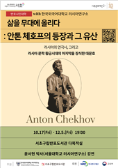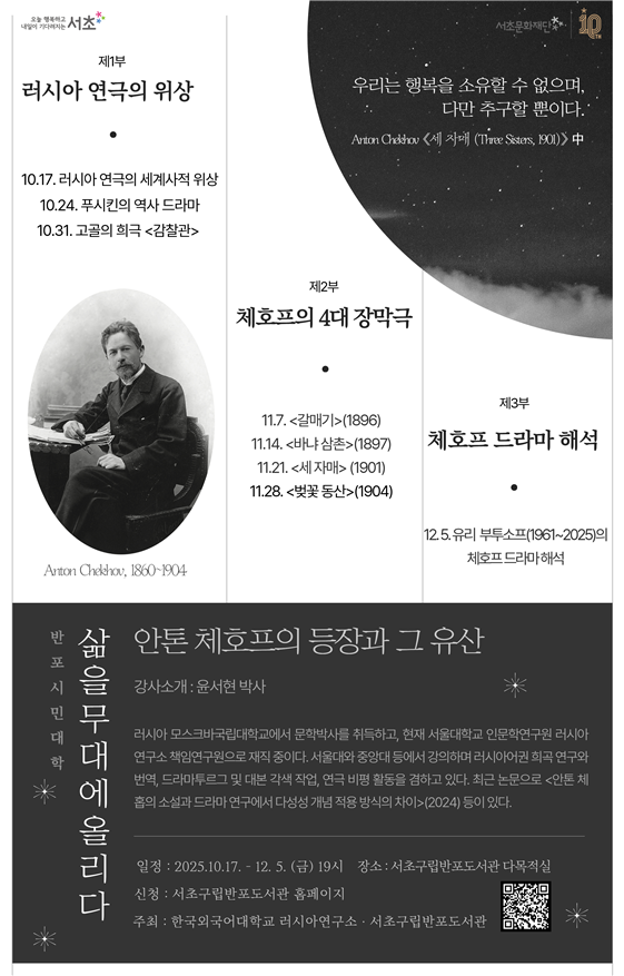 우리 연구소(소장 최우익 교수)는 10월 31일(금) 저녁 6시 서초구립 반포도서관에서 한국연구재단 제20회 인문주간을 맞이해 “삶을 무대에 올리다: 안톤 체호프의 등장과 그 유산” 주제로 대중 강연 및 북페어 행사를 개최했다. 매년 한국연구재단이 주최하는 인문주간 행사에 우리 연구소는 인문한국 플러스(HK+) 사업의 일환으로 참여했다. 이번 행사는 10월 17일(금)부터 12월 5일까지 매주 금요일마다 총 8주에 걸쳐 진행하는 반포시민강좌와 함께하는 자리로 기획했다.