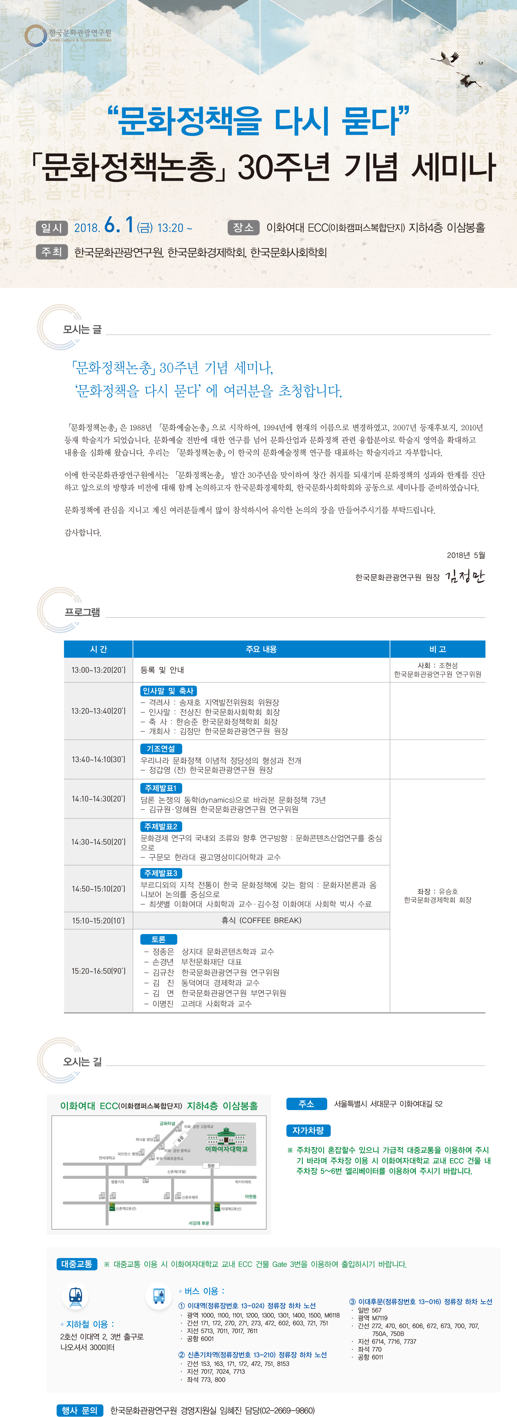 한국문화관광연구원 <문화정책논총> 발간 30주년 기념 세미나 '문화정책을 다시 묻다'에 대한 안내 올립니다. 이 세미나에는 한국문화사회학회와 한국문화경제학회가 공동주최 자격으로 참가합니다.
