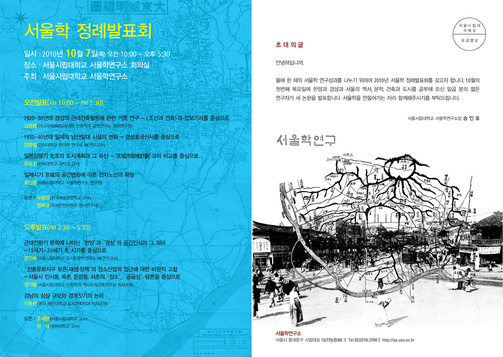 서울시립대학교 서울학연구소에서는 올해 한 해의 서울학 연구성과를 나누기 위하여 2010년 서울학 정례발표회를 갖고자 합니다. 한양과 경성과 서울의 역사, 문학, 건축과 도시를 공부해 오신 일곱 분의 젊은 연구자가 새 논문을 발표합니다. 서울학을 만들어가는 자리에 함께해 주시기를 부탁드립니다.