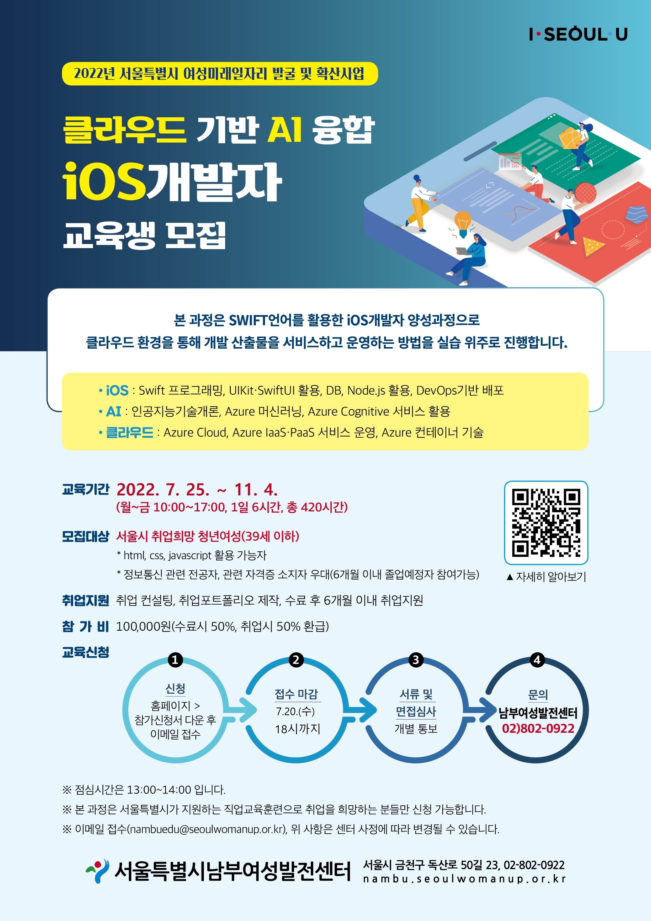 2022년 서울특별시 여성미래일자리 발굴 및 확산사업으로 「(청년여성)클라우드 기반 AI융합 iOS 개발자」, 「(청년여성)빅데이터 활용 서비스 기획자」2가지 교육과정을 운영하고자 교육생 모집을 하고 있습니다.