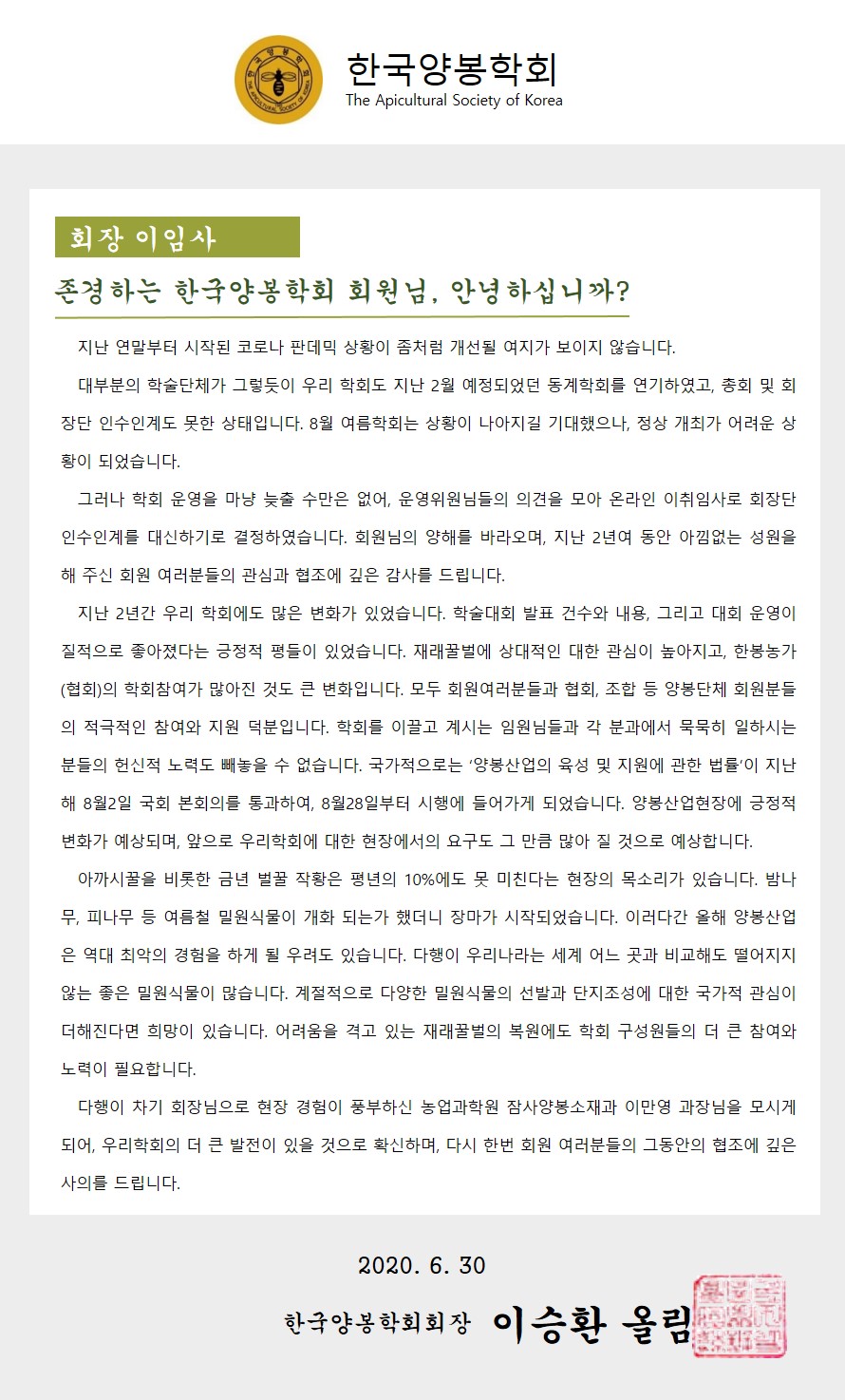 이만영 신임회장 취임사