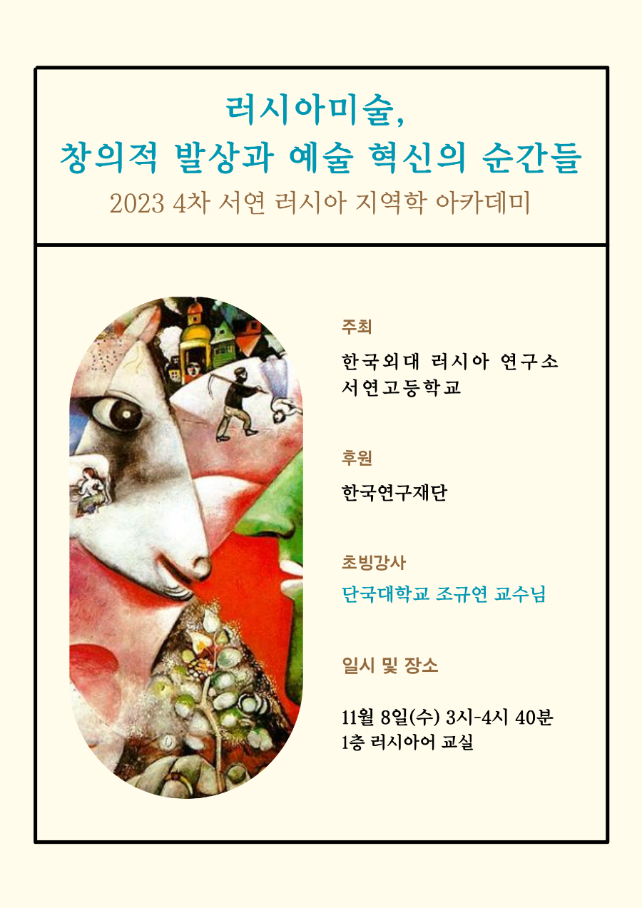 한국외국어대 러시아연구소 HK+연구사업단(소장 표상용 노어과 교수)은 2023년 11월 8일(수) 오후 3시 경기도 동탄신도시 소재 서연고등학교 1층 시청각실에서 러시아어과 학생들을 대상으로 학문후속세대 인문강좌를 진행합니다. HK+(II) <지역인문학센터>사업의 일환으로 진행하는 이번 행사에는 단국대학교 노어노문학과 조규연 교수가 '러시아 미술, 창의적 발상과 예술 혁신의 순간들'를 주제로 강의합니다. 이번 강의는 19세기 그림/회화를 통해 국민들을 계몽시키고자 했던 이동파 화가들의 사실주의 그림부터 20세기 아방가르드 작품에 이르기까지 다양한 작품을 소개하고, 이들의 비교를 통해 전혀 다른 분위기의 러시아 미술 세계를 감상할 수 있는 귀중한 시간이라고 생각합니다. 많은 관심 부탁드립니다.