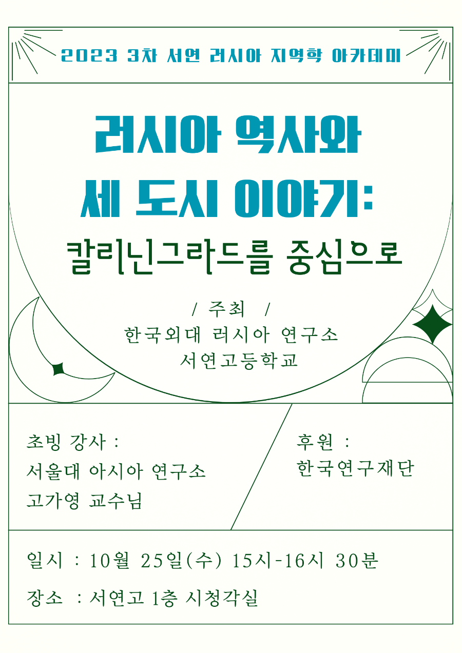 한국외국어대 러시아연구소 HK+연구사업단(소장 표상용 노어과 교수)은 2023년 10월 25일(수) 오후 3시 경기도 동탄신도시 소재 서연고등학교 1층 시청각실에서 러시아어과 학생들을 대상으로 학문후속세대 인문강좌를 진행합니다. 인문한국플러스(HK+) <지역인문학센터>사업의 일환으로 진행하는 이번 행사에는 서울대학교 아시아연구소 고가영 교수가 '러시아 역사와 세 도시 이야기: 칼리닌그라드를 중심으로'를 주제로 강의합니다. 제정러시아 이후 러시아 역사와 오랜 인연을 맺고 있는 칼리닌그라드는 러시아 본토와 떨어져 있는 전략적 공간으로서, 칸트의 고향이자 쾨니히스부르크로도 잘 알려져 있습니다. 1917년 러시아 혁명 이후 소비에트 정부 하에서 미하일 칼리닌 이름으로 변경된 오늘날 칼리닌그라드의 다양한 모습을 알 수 있는 귀중한 시간이라고 생각합니다. 많은 관심 부탁드립니다.