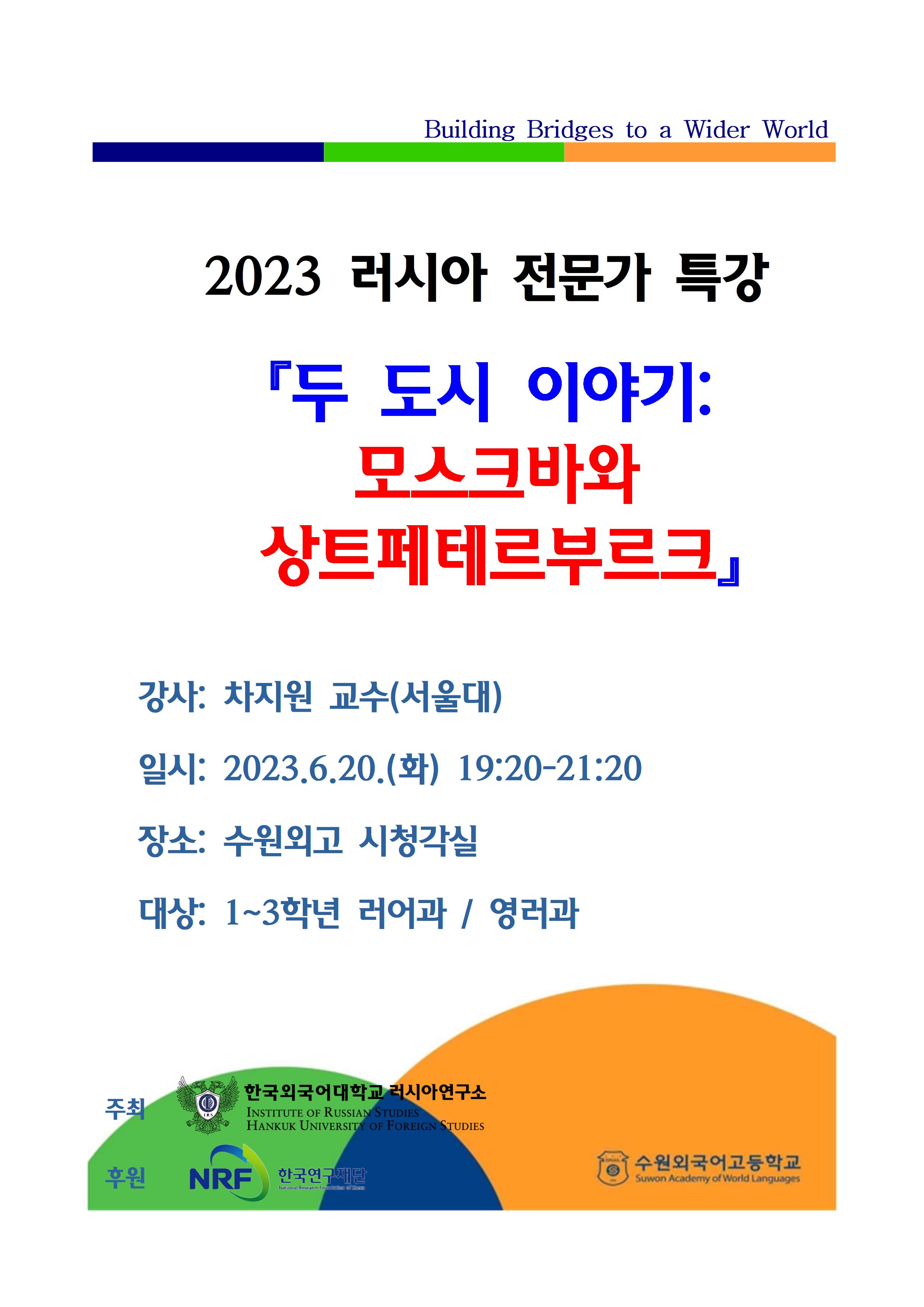 한국외국어대 러시아연구소 HK+연구사업단은 2023년 6월 20일(화) 저녁 경기도 수원외국어고등학교에서 러시아어과 및 영러과 1,2,3학년 학생들을 대상으로 인문강좌를 진행합니다. HK+ <지역인문학센터> 사업의 일환으로 진행하는 이번 행사에는 서울대학교 인문학연구원 차지원 교수가 “두 도시 이야기: 모스크바와 상트페테르부르크” 주제로 강의합니다. 모스크바와 상트페테르부르크가 고대로부터 현재에 이르기까지 러시아 역사와 문화 속에 차지하는 정치적 경제적 문화적 상징성은 아무리 강조해도 지나치지 않습니다. 수요자 중심의 고등학생을 위해 진행하는 맞춤형 강의에 많은 관심 부탁드립니다.