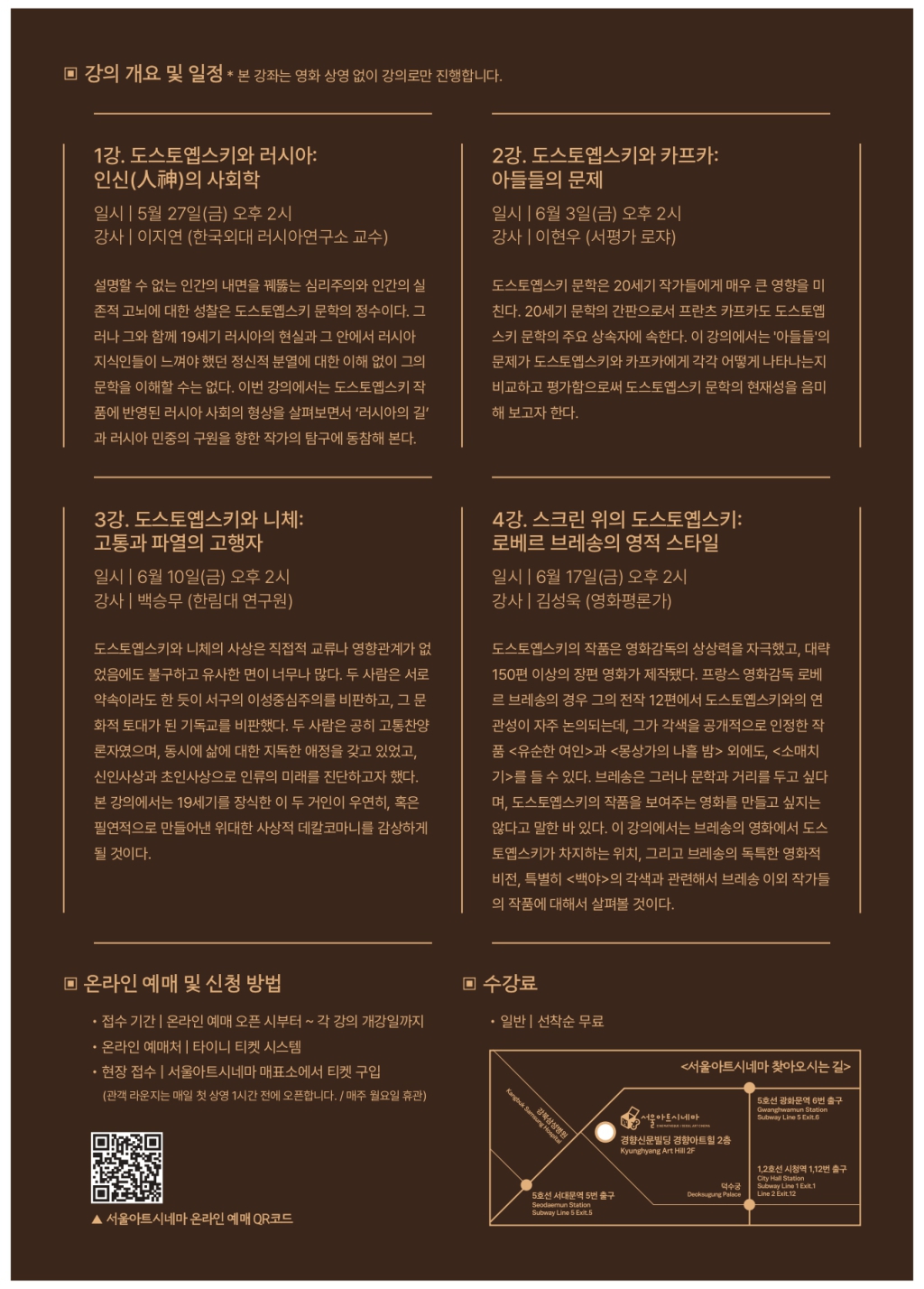 | <러시아연구소 X 한국시네마테크협의회> 러시아 문화예술 강좌: 도스토옙스키와 도스토옙스키들 일시 : 2022. 5. 27 - 6. 17 (매주 금요일 오후 2시) 장소 : 서울아트시네마 (중구 정동 22-7 경향아트힐 2층) 접수 : 온라인 예매(타이니 티켓 시스템에서 온라인 예매 오픈시부터 각 강의 개강일까지) / 현장 접수(서울아트시네마 매표소에서 구입) 강사 : 이지연(한국외대 러시아연구소 교수), 이현우(서평가 로쟈), 백승무(한림대 연구원), 김성욱(영화평론가) ![]() ![]() |