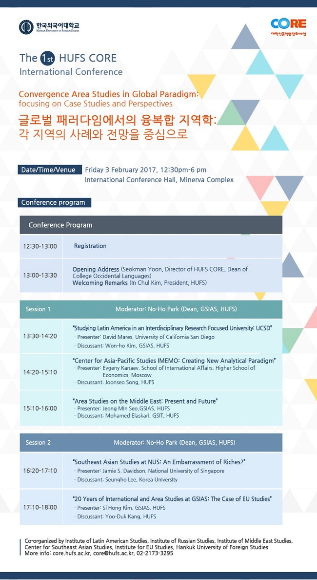 이번 학술대회는 한국외대 코어사업단 주최, 한국외대 EU연구소, 중남미연구소, 동남아연구소, 중동연구소, 러시아연구소 주관으로 진행될 예정이며,