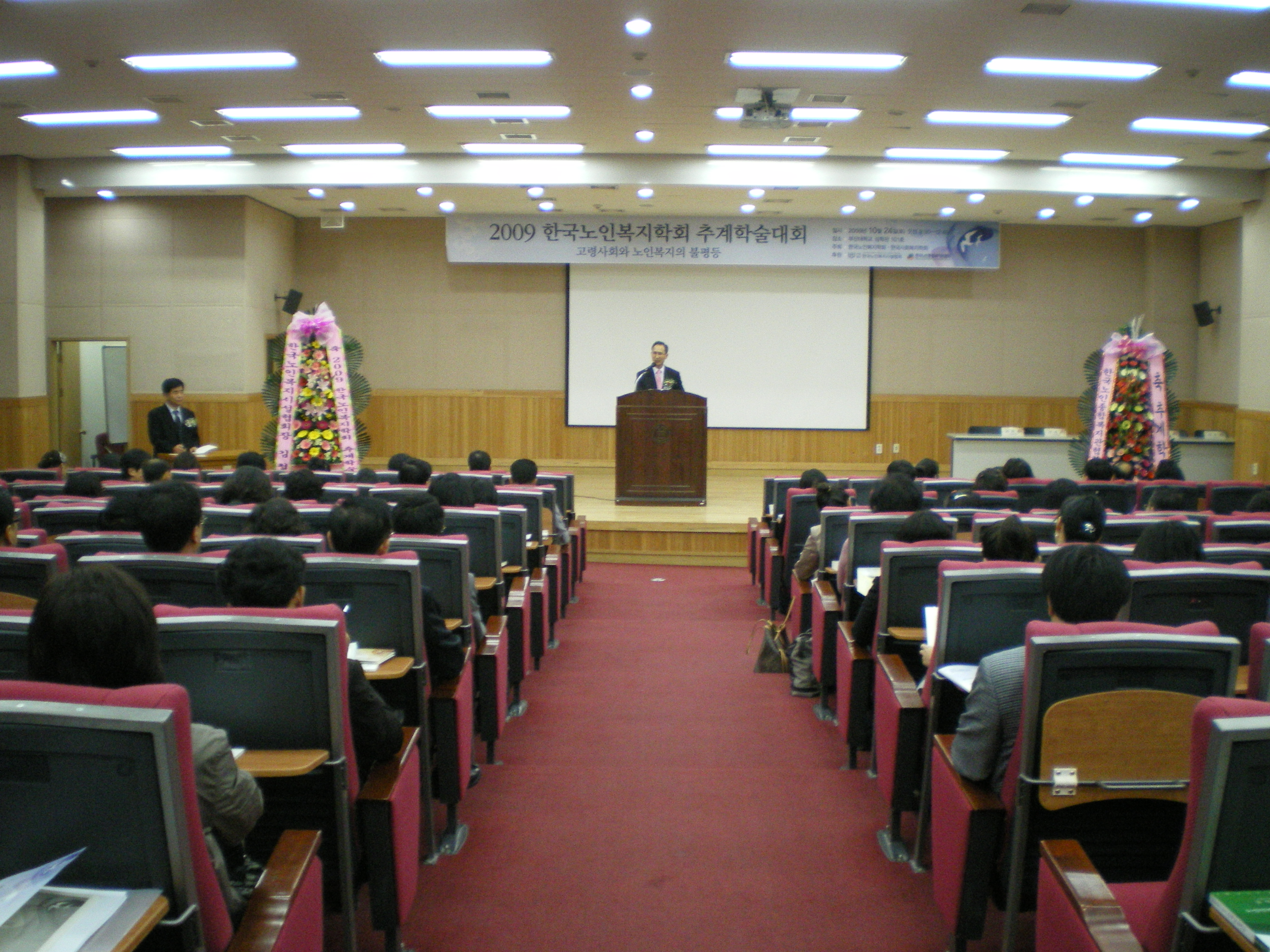 2009년 추계학술대회를 ‘고령사회와 노인복지의 불평등’이라는 주제를 가지고 부산대학교에서 200여명이 참석한 가운데 성공적으로 개최하였다. 성별간 노인복지의 불평등(석재은 교수, 한림대), 사회계층간 노인복지의 불평등(윤성호 교수, 동서대), 지역간 노인복지의 불평등(조성희 교수, 순천향대)에 대한 훌륭한 발표가 있었으며 주제별로 토론이 진행되었다. 발표와 토론 과정에서 학문적으로 크게 기여할 수 있는 연구의 방향성이 제시되었으며, 국가의 노인복지정책의 발전에 공헌할 수 있는 대책들이 논의되었다.