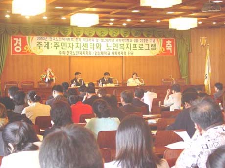 2003년 5월 16일(금) 경남대학교 본관 대회의실에서 학회 회원 및 주요인사 250여명이 참석한 가운데 <주민자치센터와 노인복지프로그램>이라는 대주제로 열린 2003년 춘계학술대회에서 발표와 토론이 진행되고 있다./ 촬영자 : 임성미