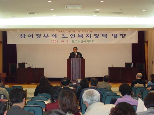 2003년 10월 31일(금) 한국사회복지회관 대강당에서 학회 회원 및 주요인사 150여명이 참석한 가운데 <참여정부의 노인복지정책 방향>이라는 대주제로 열린 2003년 추계학술대회에서 한국사회복지협의회 김득린 회장이 축사를 전하고 있다./ 촬영자 : 김나영