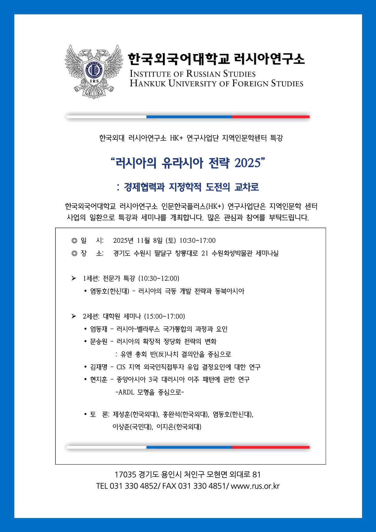 지역인문학센터 특강: "러시아의 유라시아 전략 2025: 경제협력과 지정학적 도전의 교차로"